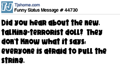 X says Did you hear about the new, talking-terrorist doll? They don't know what it says; everyone is afraid to pull the string.
