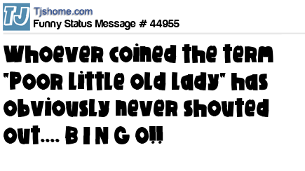 X is Whoever coined the term "Poor little old lady" has obviously never shouted out.... B I N G O!!