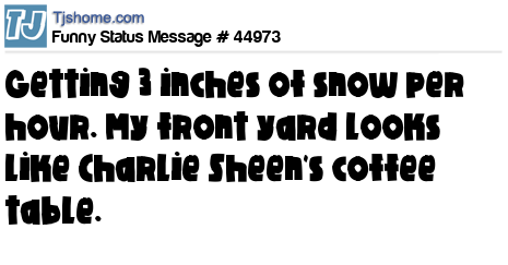 - # 44936 getting 3 inches of snow per hour. My front yard looks like Charlie Sheen's coffee table.