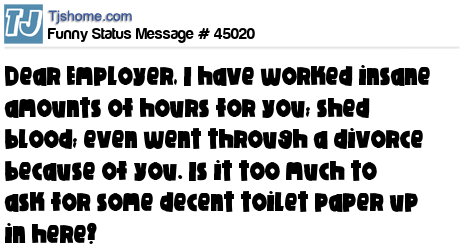 X Dear Employer, I have worked insane amounts of hours for you; shed blood; even went through a divorce because of you. Is it too much to ask for some decent toilet paper up in here?