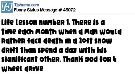X is Life Lesson number 1, There is a time each month when a man would rather face death in a 20ft snow drift than spend a day with his significant other. Thank god for 4 wheel drive