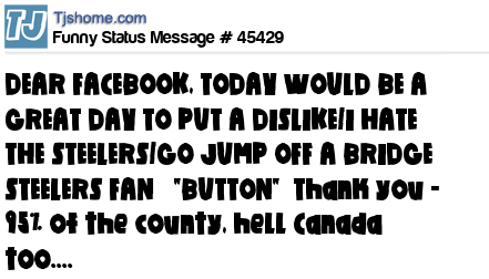 X is DEAR FACEBOOK, TODAY WOULD BE A GREAT DAY TO PUT A DISLIKE/I HATE THE STEELERS/GO JUMP OFF A BRIDGE STEELERS FAN "BUTTON" Thank you - 95% of the county, hell Canada too....