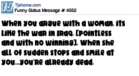 X says When you argue with a woman, its like the war in Iraq, [pointless and with no winning]. When she all of sudden stops and smile at you...you're already dead.