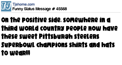 X on the positive side, somewhere in a third world country people now have these sweet Pittsburgh steelers Superbowl champions shirts and hats to wear!!