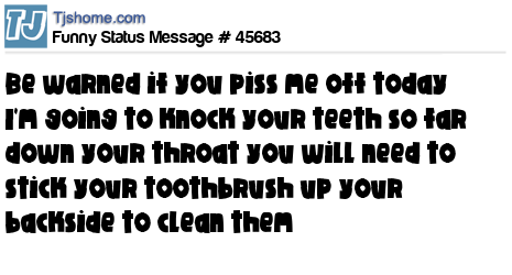 X says be warned if you piss me off today I'm going to knock your teeth so far down your throat you will need to stick your toothbrush up your backside to clean them
