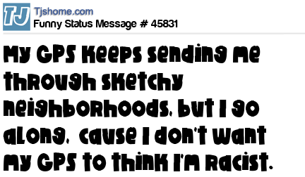 X My GPS keeps sending me through sketchy neighborhoods, but I go along, ‘cause I don't want my GPS to think I'm racist.