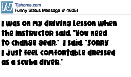 X I was on my driving lesson when the instructor said, "You need to change gear." I said, "Sorry I just feel comfortable dressed as a scuba diver."