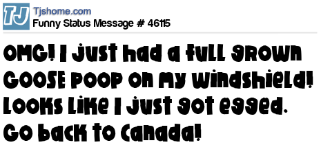 X OMG! I just had a full grown GOOSE poop on my windshield! Looks like I just got egged. Go back to Canada!