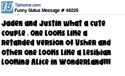 X is Jaden and Justin what a cute couple , One looks like a retarded version of Usher and other one looks like a lesibian looking Alice in Wonderland!!!