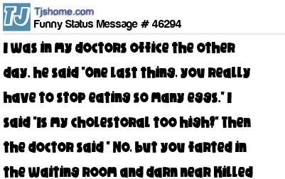 X is I was in my doctors office the other day. he said "One last thing, you really have to stop eating so many eggs." I said "Is my cholestoral too high?" Then the doctor said " No, but you farted in the waiting room and darn near killed everyubody.'
