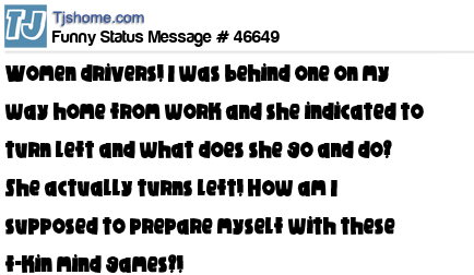 - # 183871 Women drivers! I was behind one on my way home from work and she indicated to turn left and what does she go and do? She actually turns left! How am I supposed to prepare myself with these effing mind games?!