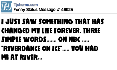 X says I JUST SAW SOMETHING THAT HAS CHANGED MY LIFE FOREVER. THREE SIMPLE WORDS....... ON NBC ..... "RIVERDANCE ON ICE"..... YOU HAD ME AT RIVER...