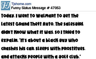 X is Today, I went to Walmart to get the latest Grand Theft Auto. The salesgirl didn't know what it was, so I tried to expalin. "It's about a black guy who crashes his car, sleeps with prostitues, and attacks people with a golf club." She came back with Tiger