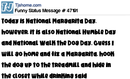 X Today is National Margarita Day, however, it is also National Humble Day and National Walk the Dog Day. Guess I will go home and fix a Margarita, hook the dog up to the treadmill and hide in the closet while drinking said Margarita.