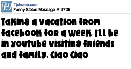 X is taking a vacation from facebook for a week, I'll be in youtube visiting friends and family. Ciao Ciao