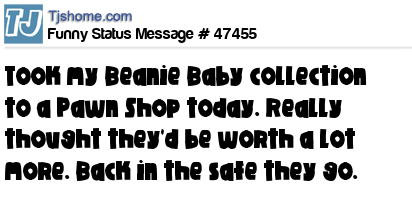 X Took my Beanie Baby collection to a Pawn Shop today. Really thought they'd be worth a lot more. Back in the safe they go.