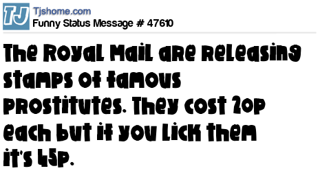 X The Royal Mail are releasing stamps of famous prostitutes. They cost 20p each but if you lick them it's 45p.