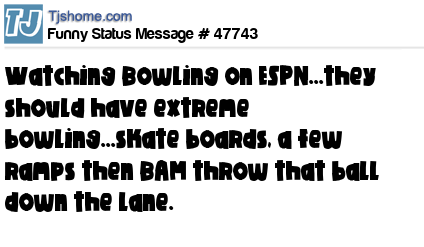 X Watching Bowling on ESPN...they should have extreme bowling...skate boards, a few ramps then BAM throw that ball down the lane.