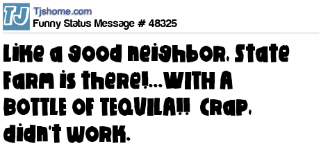 X Like a good neighbor, State Farm is there!...WITH A BOTTLE OF TEQUILA!! Crap, didn't work.