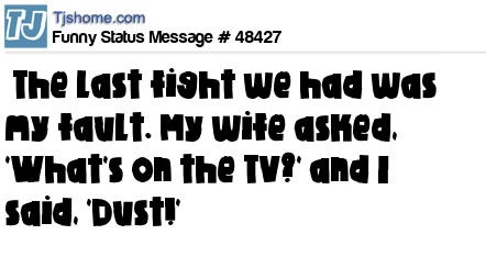 X says The last fight we had was my fault. My wife asked, 'What's on the TV?' and I said, 'Dust!'