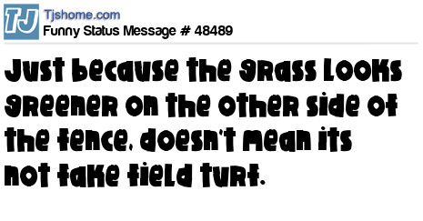 - # 36843 The old saying "The grass is always greener on the other side of the fence"....is it? Or maybe you just need to get up off UR lazy ass and mow the lawn, water it, pull some weeds, fertilize it, take care of your own grass and stop looking over the fence