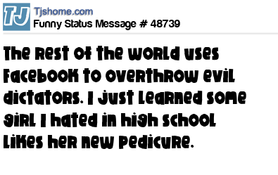 X is The rest of the world uses Facebook to overthrow evil dictators. I just learned some girl I hated in high school likes her new pedicure.