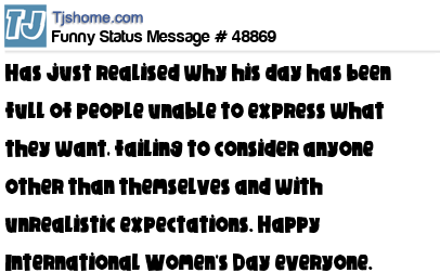 - # 146563 just realised why my day has been full of people unable to express what they want, failing to consider anyone other than themselves and with unrealistic expectations. Happy International Women’s Day everyone.