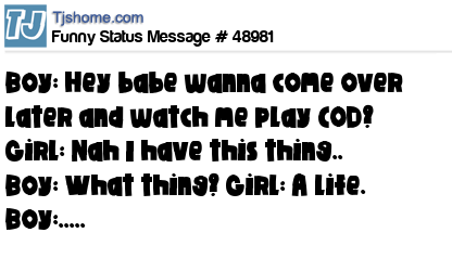 X is Boy: Hey babe wanna come over later and watch me play COD? Girl: Nah I have this thing.. Boy: What thing? Girl: A life. Boy:.....