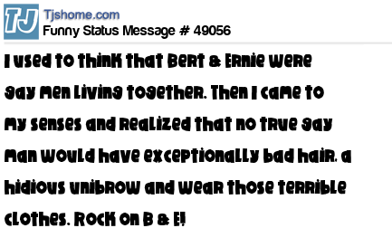 X I used to think that Bert & Ernie were gay men living together. Then I came to my senses and realized that no true gay man would have exceptionally bad hair, a hidious unibrow and wear those terrible clothes. Rock on B & E!