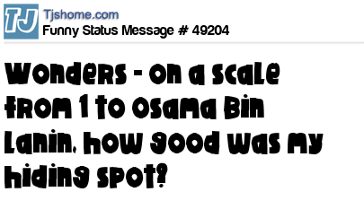 - # 96217 On a scale of 1 to Osama Bin Ladin, how good was my hiding spot??
