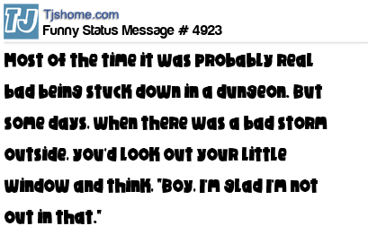 X says Most of the time it was probably real bad being stuck down in a dungeon. But some days, when there was a bad storm outside, you'd look out your little window and think, "Boy, I'm glad I'm not out in that."