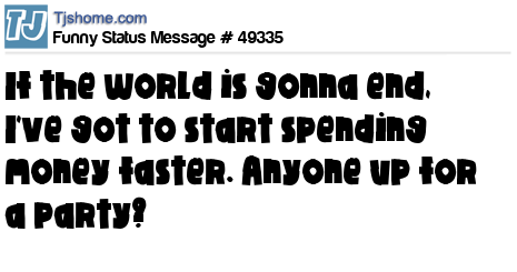 X says If the world is gonna end, I've got to start spending money faster. Anyone up for a party?