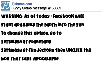 - # 47415 WARNING!! As of today - Facebook will automatically start dragging Earth into the Sun. To change this option, go to Settings > Planetary Settings > Trajectory then UNCLICK the box that says ' Apocalypse.' Facebook kept this one quite.