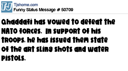 X is Qhaddafi has vowed to defeat the NATO forces. In support of his troops, he has issued them state of the art sling shots and water pistols.