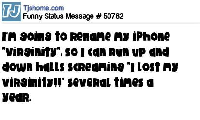 X I'm going to rename my iPhone "virginity", so I can run up and down halls screaming "I lost my virginity!!" several times a year.