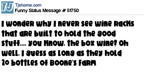 X I wonder why I never see wine racks that are built to hold the good stuff.... you know, the box wine? Oh well, I guess as long as they hold 20 bottles of Boone's Farm