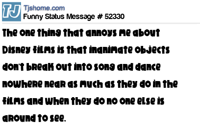 X the one thing that annoys me about Disney films is that inanimate objects don't break out into song and dance nowhere near as much as they do in the films and when they do no one else is around to see.