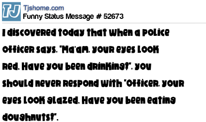 - # 27234 discovered today that when a police officer says, "Ma'am, your eyes look red. Have you been drinking?", you should never respond with "Officer, your eyes look glazed. Have you been eating doughnuts?"