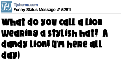 X What do you call a lion wearing a stylish hat? A dandy lion! (I'm here all day)
