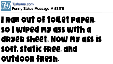X is I ran out of toilet paper, so I wiped my ass with a dryer sheet. Now my ass is soft, static free, and outdoor fresh.