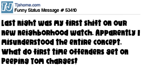X is Last night was my first shift on our new neighborhood watch. Apparently I misunderstood the entire concept. What do first time offenders get on Peeping Tom charges?