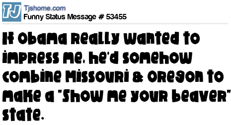 - # 114612 If Obama really wanted to impress me... he'd somehow combine Missouri & Oregon to make a "Show me your beaver" state.