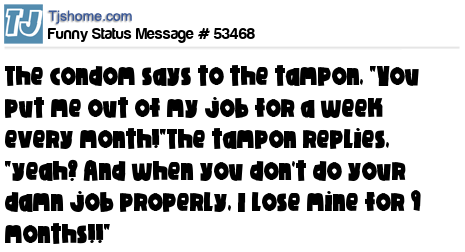 - # 61315 Condom says to the tampon, "You put me out of a job for 1 week a month!" The tampon replies, "When you don't do your job properly, I lose mine for 9 months!"