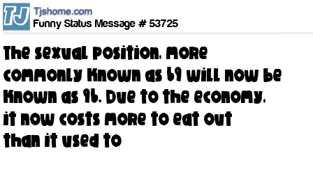 - # 17008 The sexual position 69 is now 96, due to the poor economy the price of eating out has gone up