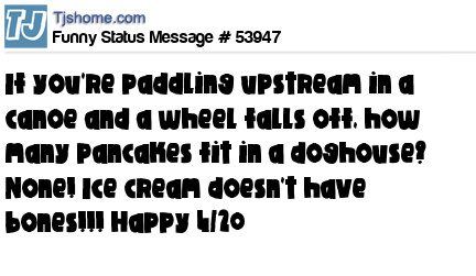 X If you're paddling upstream in a canoe and a wheel falls off, how many pancakes fit in a doghouse? None! Ice cream doesn't have bones!!! Happy 4/20