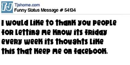 X says i would like to thank you people for letting me know its friday every week its thoughts like this that keep me on facebook.