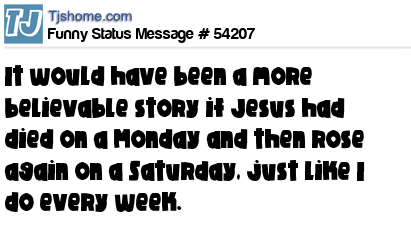 X It would have been a more believable story if Jesus had died on a Monday and then rose again on a Saturday, just like I do every week.