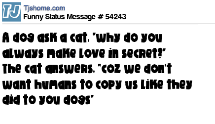 X is A dog ask a cat, "why do you always make love in secret?" The cat answers, "coz we don't want humans to copy us like they did to you dogs"
