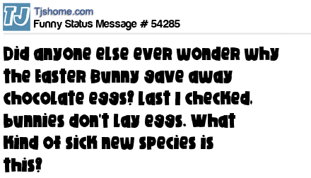 X is Did anyone else ever wonder why the Easter Bunny gave away chocolate eggs? Last I checked, bunnies don't lay eggs. What kind of sick new species is this?