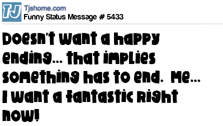 - # 5476 I don't want a happy ending... that implies something has to end..I want a fantastic right now! !! Oh, but wait. I've heard happy endings can be good!! I need to check into that!